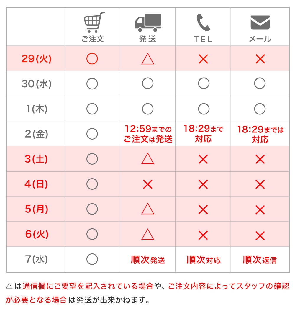 この間ご注文・メールによるお問い合わせは期間中も通常通り受け付けております。 ぜひご利用くださいませ。
